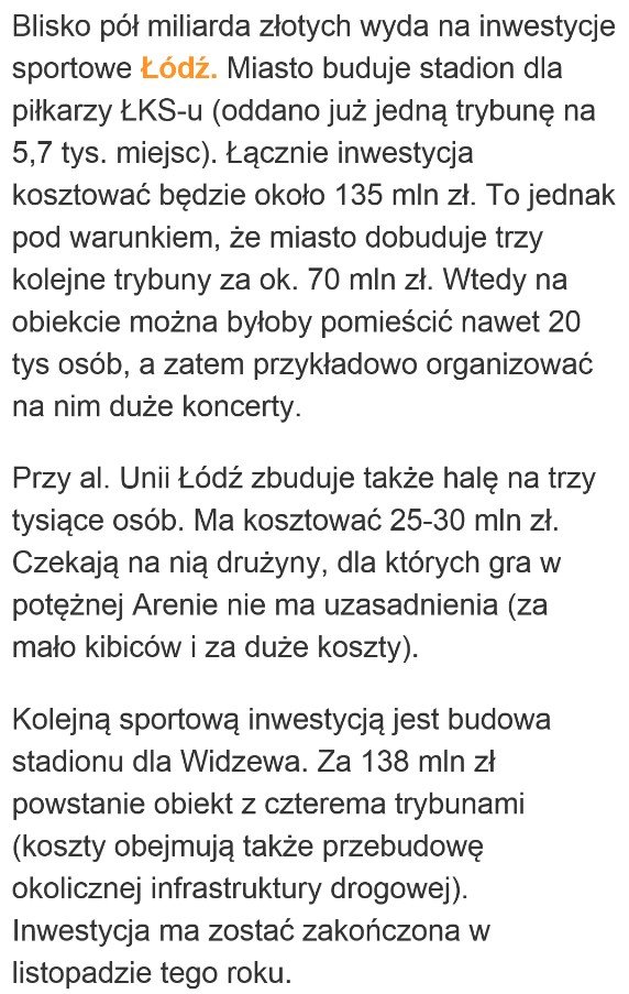 Tuż przed startem nowego sezonu na A8 ma zostać zamontowany telebim. Wieszczono jego instalację od kilku lat. W tym czasie zdążył się skurczyć, a w zasadzie ewoluować w stronę tablicy świetlnej. Z zapowiadanych 20 m2 (koszt 1m2 to ok. 6 tys) powierzchni LED (o tym m.in. tu), zrobiło się 5m2 w technologii z lat 90-tych XX wieku. Najważniejsze, że kolejny wymóg licencyjny spełniony. Do zakończenia remontu/przebudowy A8 już naprawdę niedaleko. Teraz pan prezydent WW wróciwszy z urlopu rzucił kolejną frytkę: mam prawie 2 bańki na stadion. Ulala! To plus po 2,5 mln co roku, licząc od 2014, to już ile się nazbierało? Masa klopsu. Tylko jak te marne 1,8 wygląda przy 5 mln na dzień dobry na tor łyżwiarski, czy kolejnej 5 melonach na pływalnie przy Robotniczej. Komuś się wydaje, że jak co roku coś się obieca i znów jakoś obleci. Ale skoro od lat to działa, jakoś się kula, to po co zmieniać? W następnej kolejności ogłosi się dla picu kilka nieudanych/nierozstrzygniętych przetargów i temat będzie można uznać za załatwiony. Za te przyobiecane po raz 1945 środki pt. remont A8 ogarnie się wychodki od strony gimnazjum (chyba szybciej zniknie gimnazjum, bo już ustawę o zmianach w szkolnictwie klepnął Sejm) i w zasadzie będzie cacy. Potem już tylko odmalowanie budynku biurowego, wiecha na dach, zakup 20 nożyczek do przecięcia wstęgi (dla każdego przecinającego) i finiszowa impreza. Wszyscy zadowoleni, na czele z przybłędami z Krakusa. Tymi, które ZA DARMO, kolejny sezon będą podejmowały ligowych rywali na A8. Nie byle jakich, bo m.in. Widzew (powoli kończą swój obiekt) i ŁKS Łódź (otwierają stadion etapami). W skrócie o inwestycjach w stadiony magistratu m. Łódź tu. Komentarz zbyteczny.